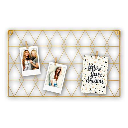 Geometrikus díszítéssel készült arany színű keret, 3 db fából készült fotócsipesszel.