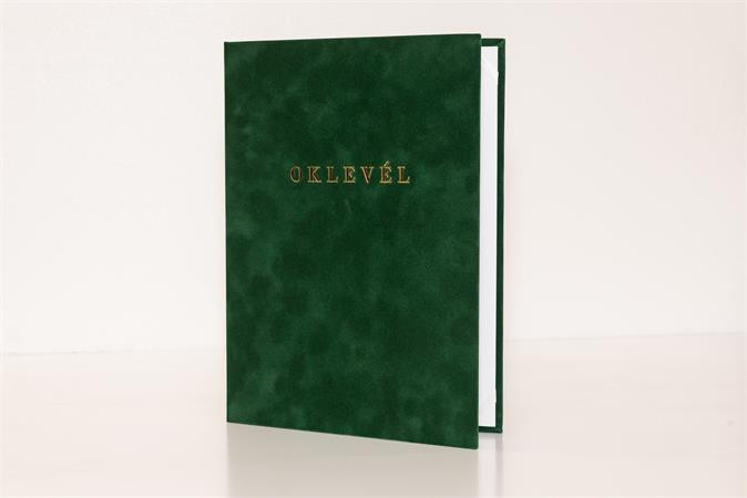 . Oklevéltartó, A4, exkluzív, plüss, aranyozva, zöld