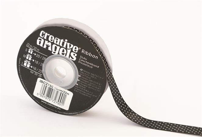 . Szatén szalag, 15 mm x 22 m, fekete fehér pöttyökkel