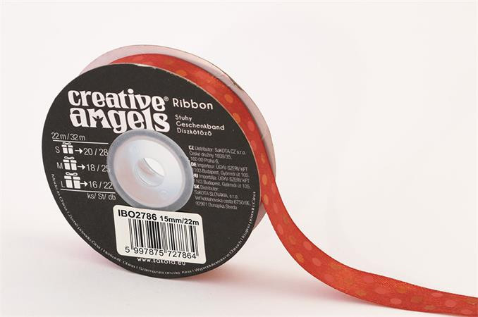 . Szatén szalag, 15 mm x 22 m, piros vegyes pöttyökkel