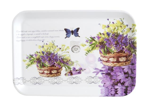 . Tálca, műanyag, szögletes, levendula mintás, 34x23cm