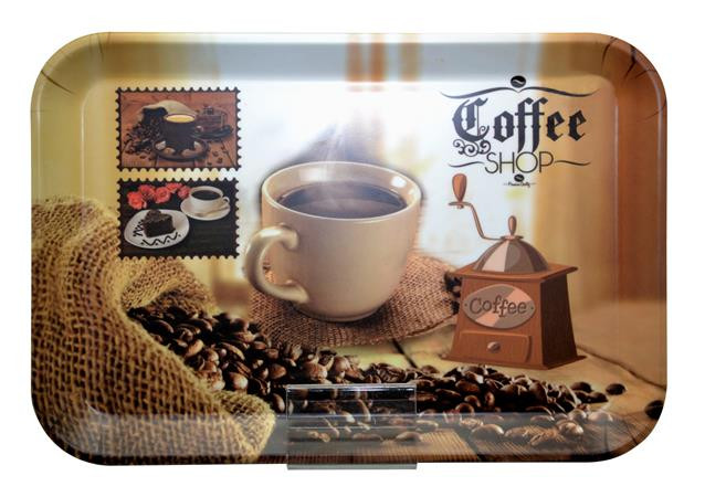 . Tálca, szögletes, műanyag, kávéház mintás, 21x14 cm