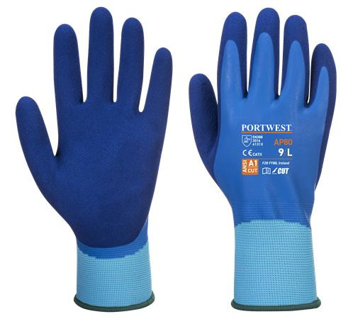 . Védőkesztyű, latex, latexhab, tenyerén mártott, L méret "Liquid Pro", kék