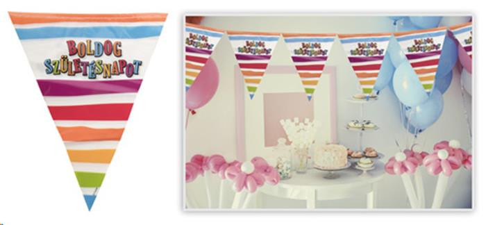 Születésnapi parti dekorációs eleme lehet ez a színes, csíkos-pöttyös zászlós girland. Egészítsd ki hozzá illő tányér, pohár, szalvéta együttesével.