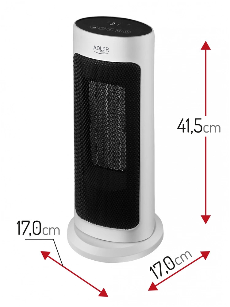 Fűtőventilátor hatékony kerámia fűtéssel, LED kijelzővel és távirányítóval. A készülék időzítővel rendelkezik, amely lehetővé teszi az üzemidő 1 és 12 óra közötti beállítását. LCD kijelző mutatja a kiválasztott hőmérsékletet 15-40°C tartományban, a kiválasztott funkciók aktiválásával. A fűtőventillátor 1400 W vagy 2000 W teljesítménnyel fűt, vízszintes oszcillációs funkcióval rendelkezik 50°-os tartományban, biztonsági kapcsolóval, amely a készülék felborulása esetén automatikusan megszakítja az áramellátást, túlmelegedés elleni védelemmel és egy fogantyúval a könnyű hordozhatóság érdekében. A készülék távirányítóval van felszerelve.