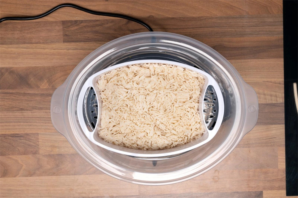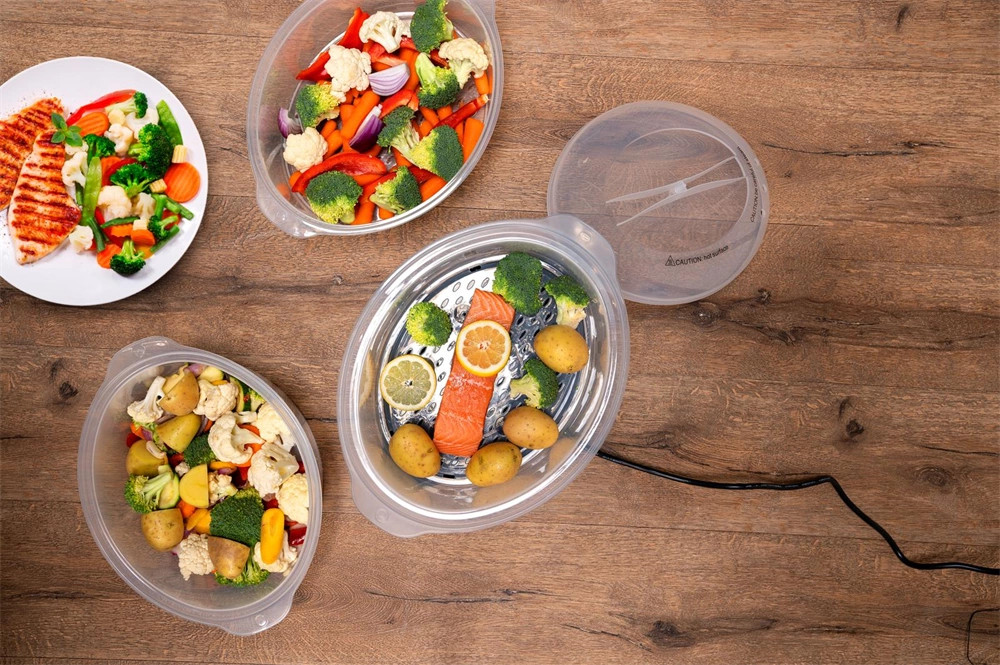 - 3 BPA-mentes gőzölő tálca – Különböző hozzávalók elkülönített párolásához.