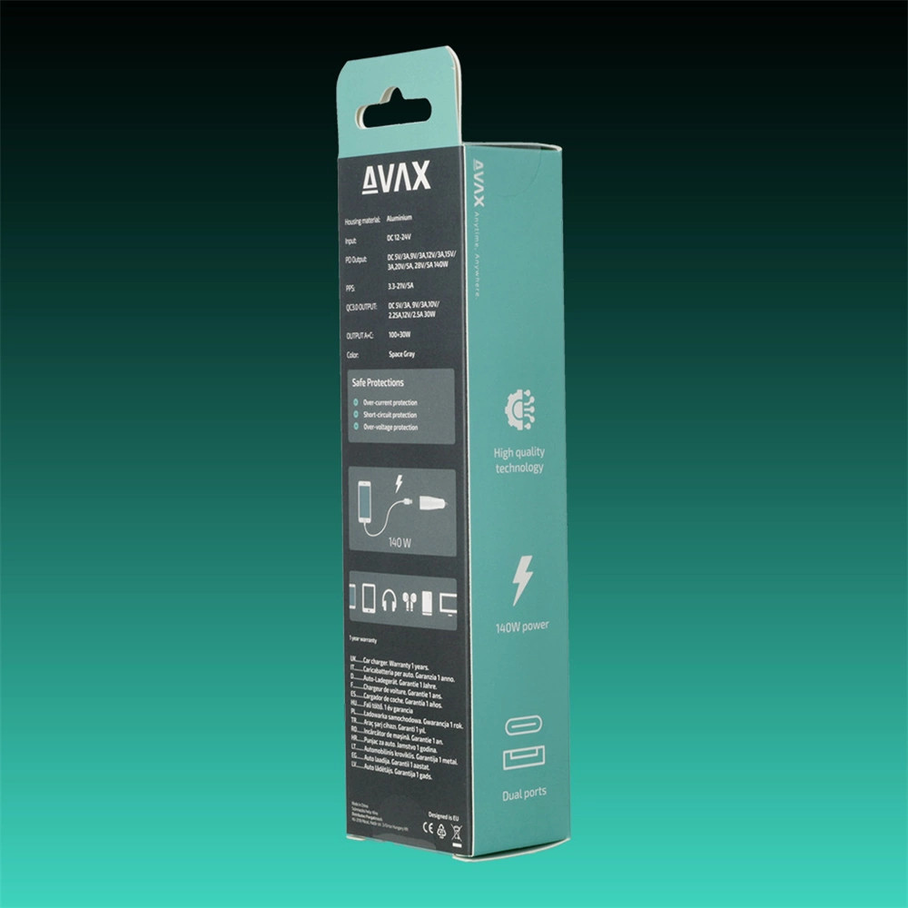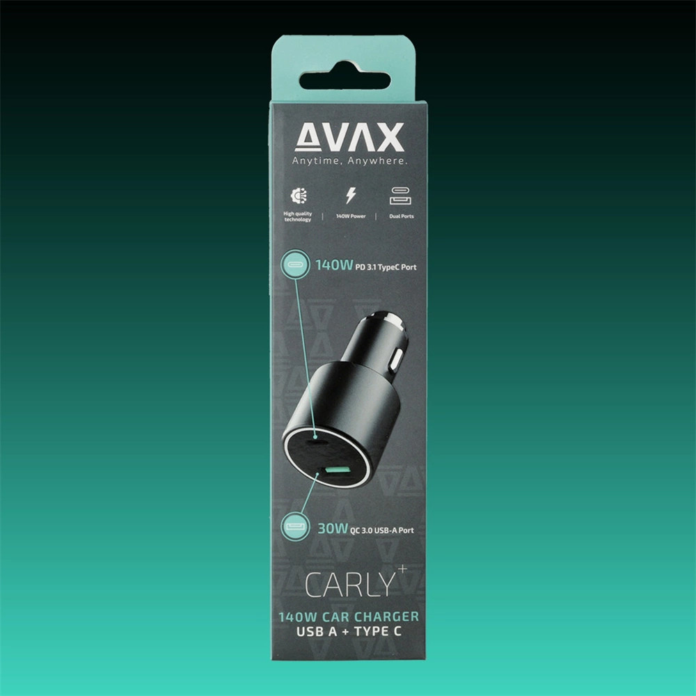 Az AVAX CARLY+ autós gyorstöltő egyszerre 140W teljesítményt nyújt, lehetővé téve, hogy több eszközt is gyorsan és hatékonyan tölthessen. Az autós töltő USB-C 3.1 PD portja 140W-ot, míg az USB-A port Quick Charge 3.0 technológiát használva 30W-ot szállít, így akár két eszközt is egyszerre tölthet.