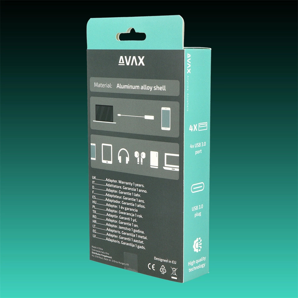 Az USB-C HUB négy USB 3.0 porttal rendelkezik, így egyszerre több külső eszközt is csatlakoztathatsz. USB elosztó laptophoz, Pendrive-hoz, egér- és billentyűzetekhez, nyomtatókhoz és más USB-kompatibilis eszközökhöz.