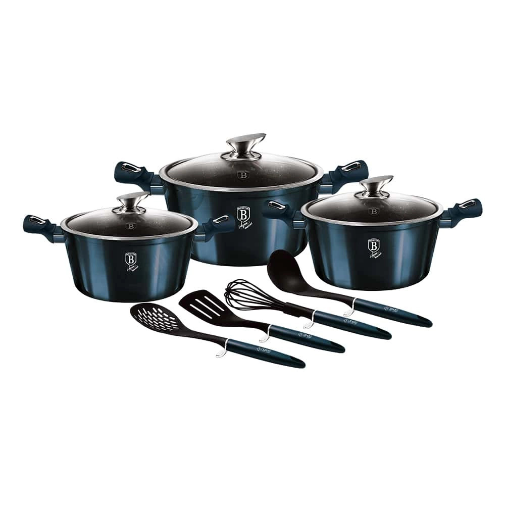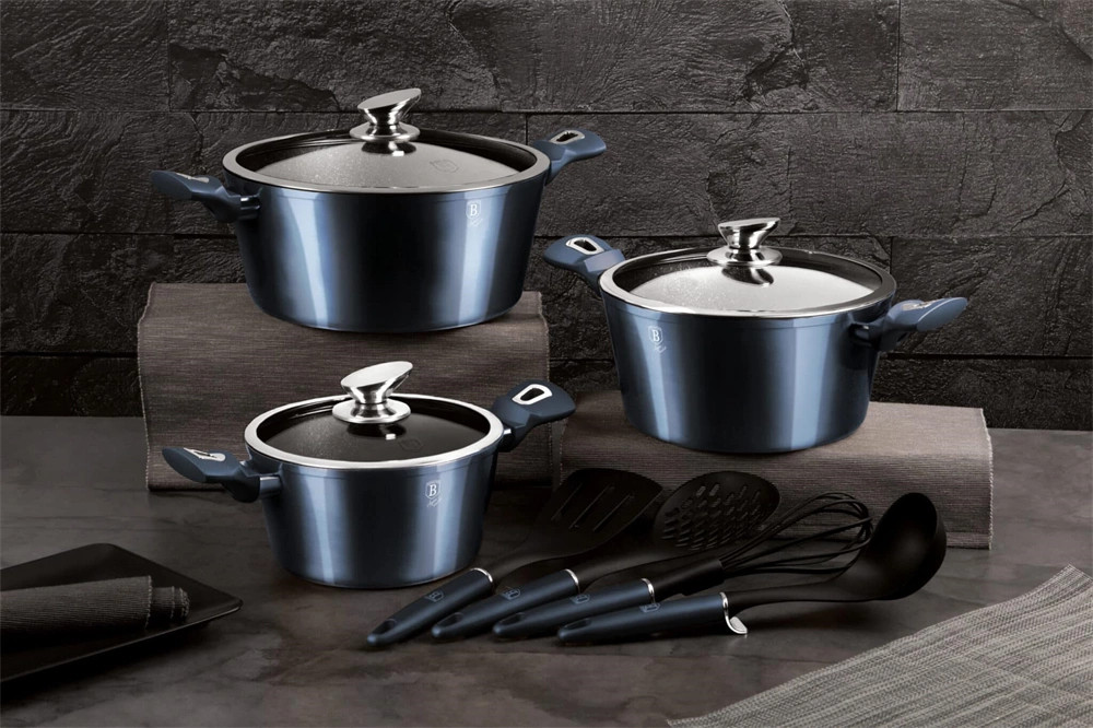 Az 10 részes készlet magában foglal három lábast fedővel: O20*10 cm 2,5L, O24*12 cm 4,1L és O28*12.5 cm 6,1L, valamint négy konyhai eszközt: merőkanál, habverő, fordítólapát és fölöző kanál. Ez a teljes készlet megfelel minden főzési igénynek.