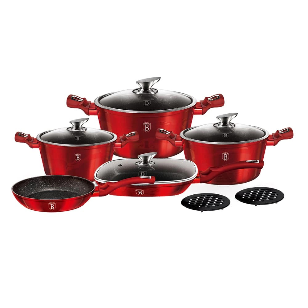 Az edénykészlet tartalmaz három különböző méretű lábassal és fedővel (O20*10 cm 2,5L, O24*12 cm 4,1L, O28*12,5 cm 6,1L), egy serpenyővel (O20*4,5 cm 1,0L), egy grill serpenyővel fedővel (O28*28*4,1 cm 2,1L) és két fekete műanyag alátéttel.