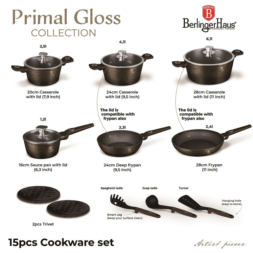 A készlet PFOA, LEAD és cadmium mentes, így környezetbarát és egészséges választás a mindennapi főzéshez.A Primal Gloss Collection 15 részes edénykészlete nemcsak a konyhai feladatokat könnyíti meg, hanem stílusos megjelenésével a konyha éke is lehet. Fedezze fel a főzés örömét ezzel a prémium minőségű készlettel!