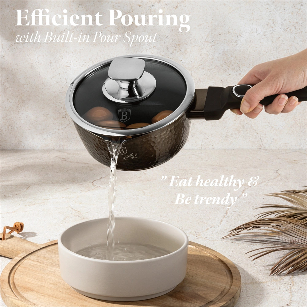 A sötét szürke-fekete, kalapács hatású felület elegáns megjelenést kölcsönöz a készletnek, amely bármely konyhai stílushoz illeszkedik.