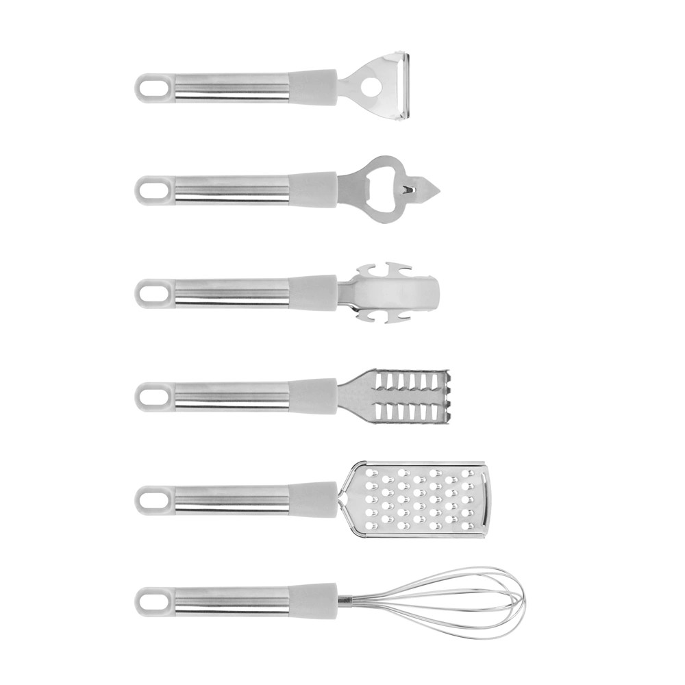 Rozsdamentes acél nyéllel rendelkező konyhai eszköz szett. Helytakarékosan, könnyen áttekinthetően tárolhatja a mindennapi használati eszközeit. A főzés szinte minden területét lefedő készletben talál többek között habverőt, sajtreszelőt, zöldséghámozót, halpikkely eltávolító eszközt, sörbontót, konzervbontót is.