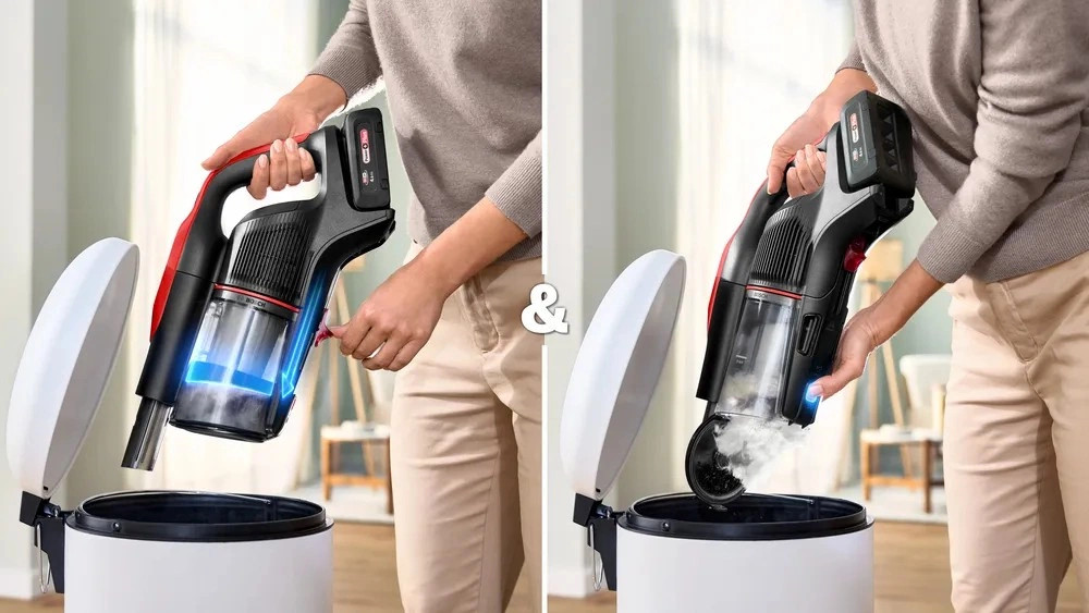 Könnyen üríthető portartály tömörítő csúszkával: higiénikus ürítés a fedél kinyitásával és a tömörített por kitolásával a csúszka segítségével. A tömörítésnek köszönhetően ritkábban van szükség a portartály ürítésére.