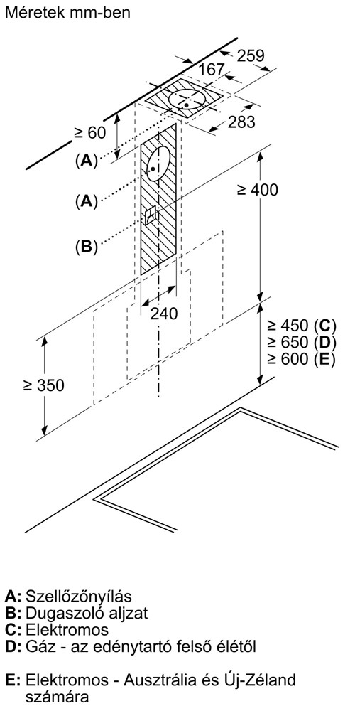 - Minimális magasság elektromos főzőlap fölött: 450 mm