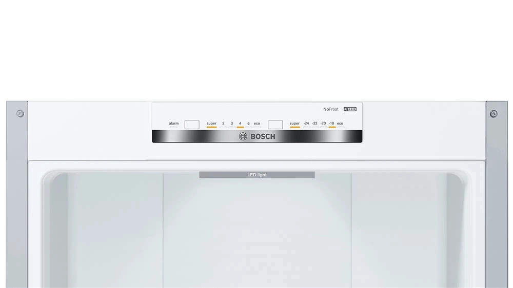- Kezelő- és jelzőelemek: Fagyasztó hőmérséklet kijelzése, Fagyasztó super fokozat, Fagyasztótér figyelmeztető, Hangjelzés: ajtó nyitva, Hangjelzés hiba esetén, Hűtő hőmérséklet kijelzése, Hűtő super fokozat