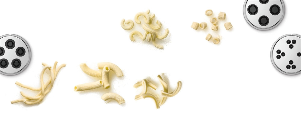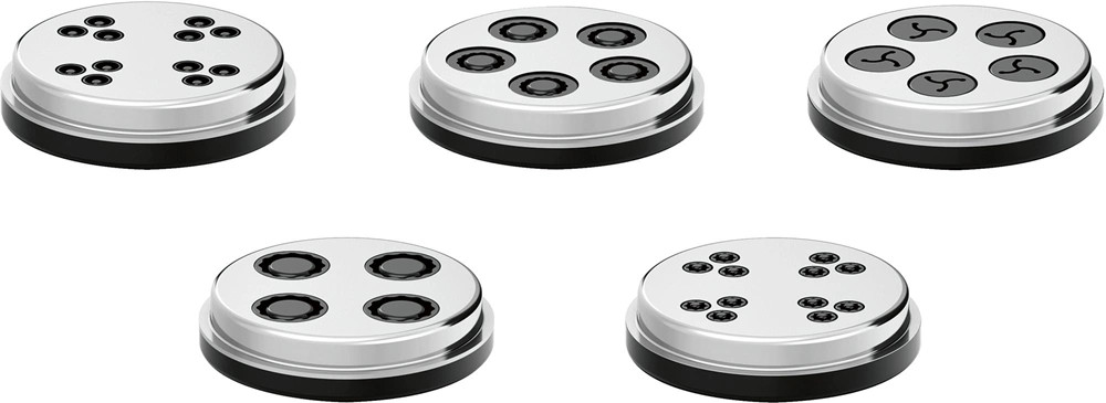5 különböző kinyomólemez a különböző otthon készíthető tésztákért (Ditaloni rigati, Cellentani, Rigatoni, Fussili, Makaróni)