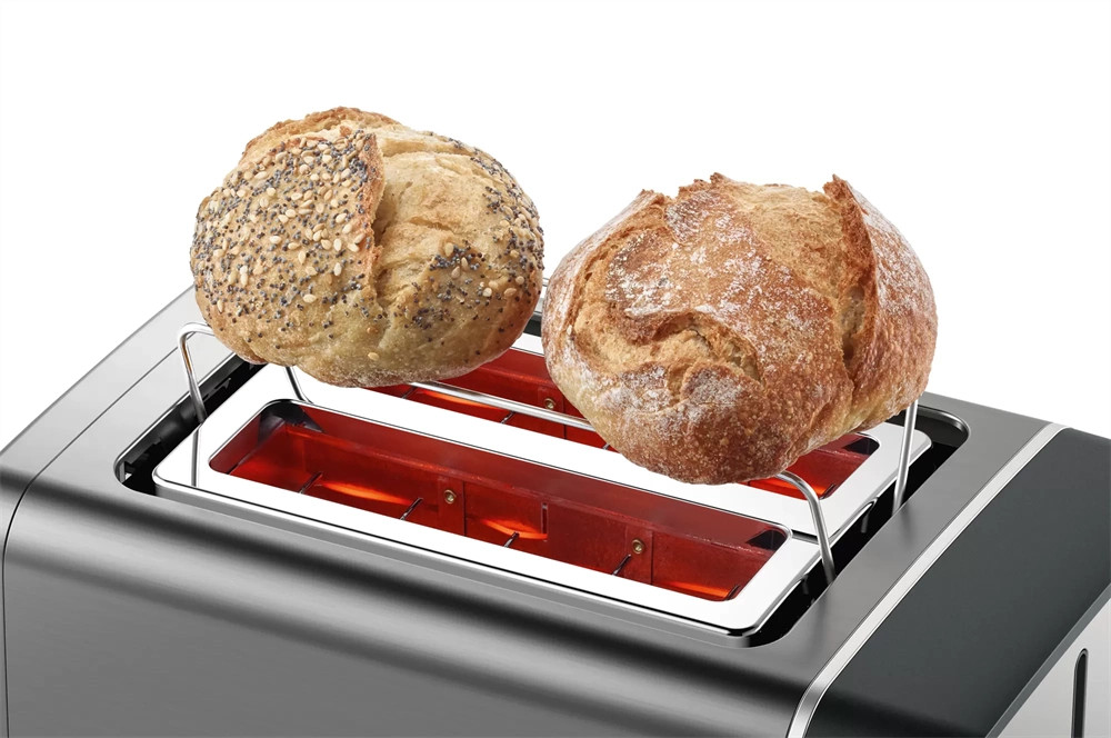 - Fokozatmentes pirítási erősség-szabályozó gomb, integrált melegítőráccsal