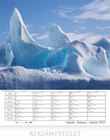 -naptár rész: magyar, angol, német nyelven, magyar ünnepek és névnapokkal, napkelte, napnyugta és holdállás feltüntetésével