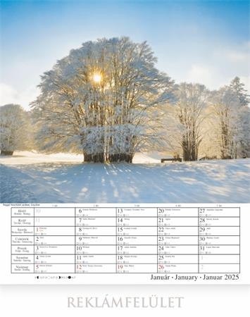 -naptár rész: magyar, angol, német nyelven, magyar ünnepek és névnapokkal, napkelte, napnyugta és holdállás feltüntetésével