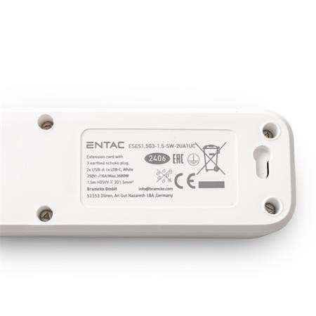 ENTAC Elosztósor, 3 aljzat, 1,5 m, USB, kapcsolóval, ENTAC, fehér