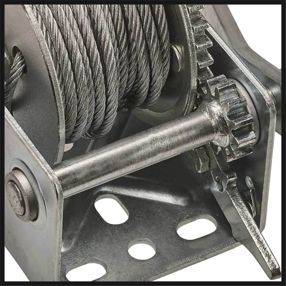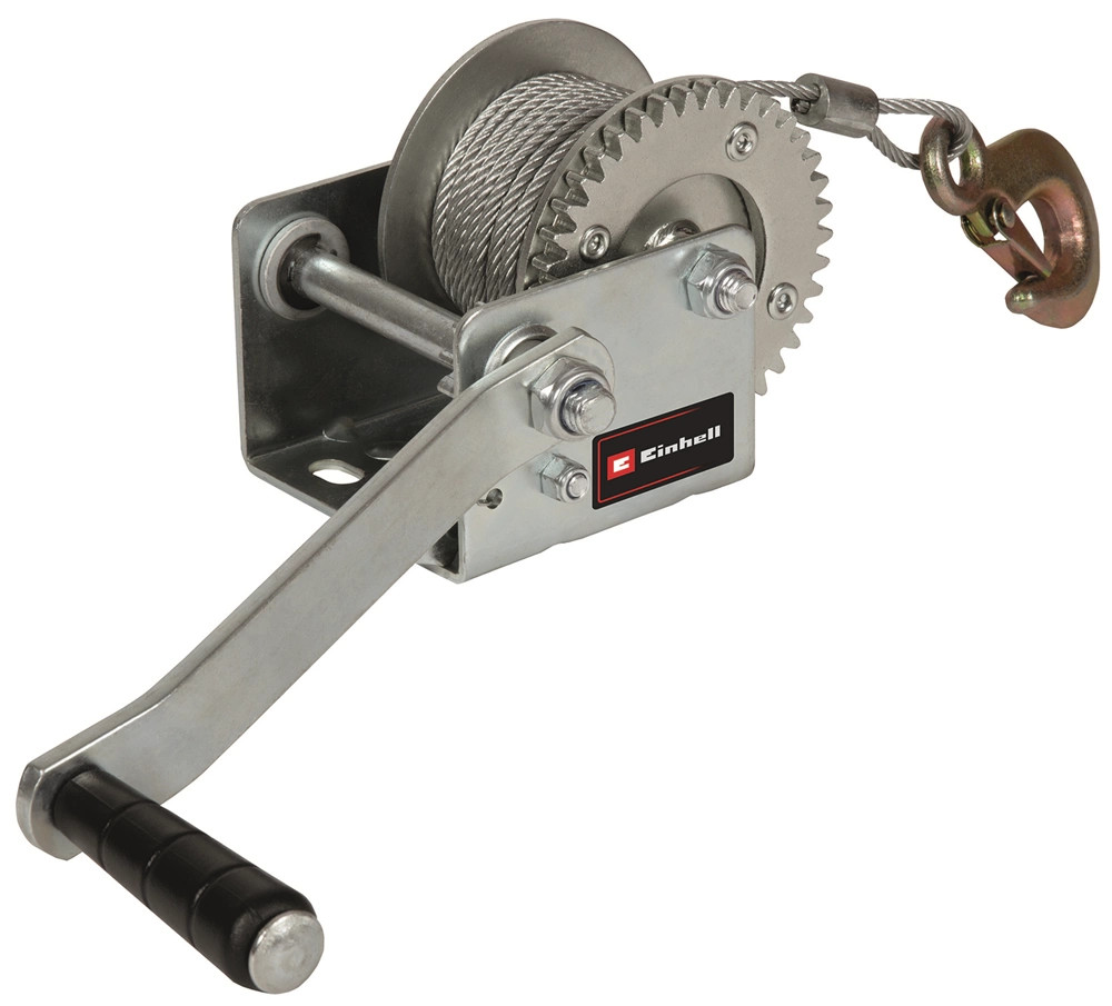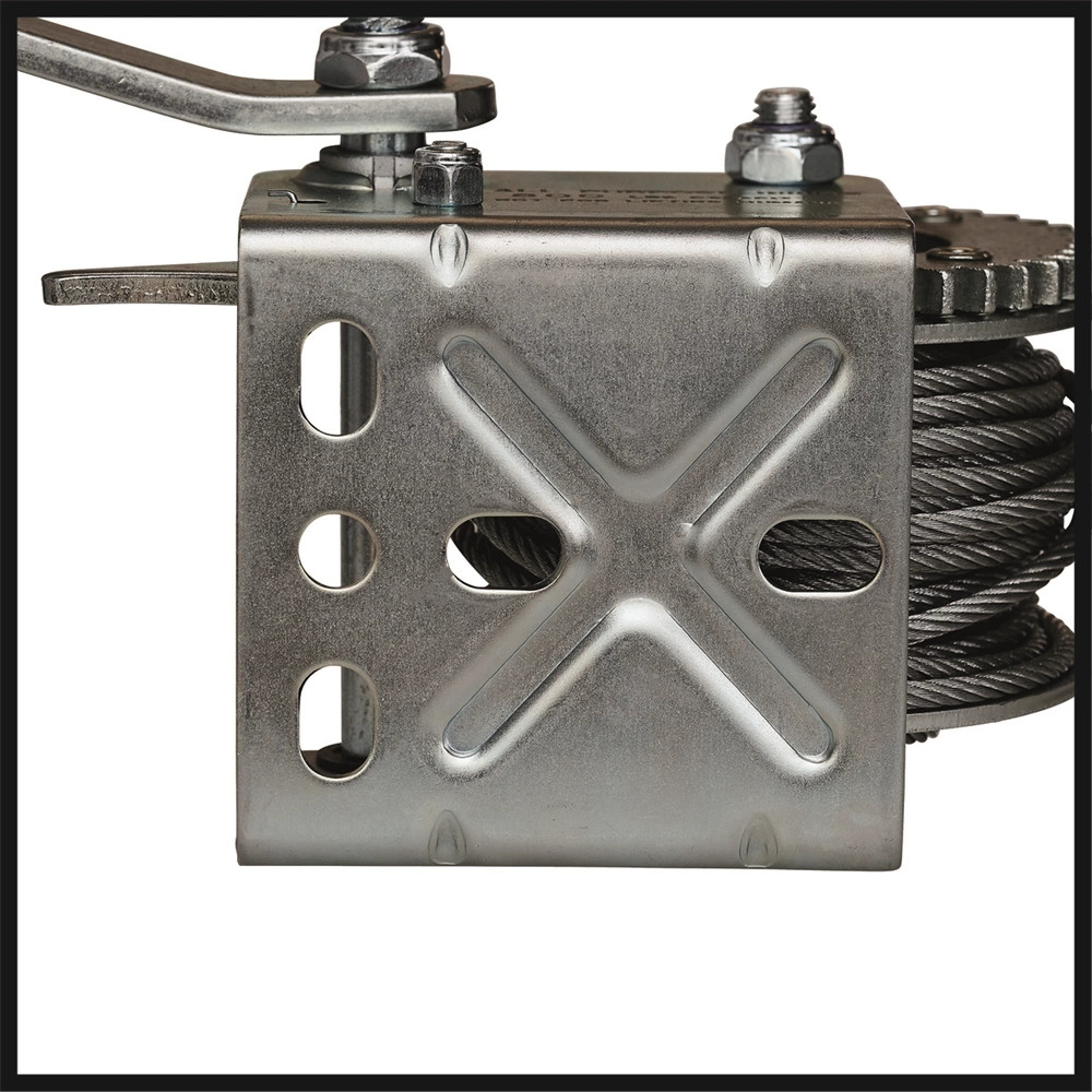 Az Einhell TC-WI 500 kézi csörlő maximális terhelhetősége 500 kilogramm. A gyári csomagolás tartalmazza a 10 méter hosszú, csavarodásmentes drótkötelet (O 4,2 mm) és a biztonsági karabinerrel felszerelt horgot is. A biztonsági karabiner megakadályozza, hogy a rögzített teher ki- vagy lecsúszhasson a horogról. A kilincsmű segítségével biztonságosan megállíthatja a kötelet és a terhet. A kézi hajtókar Softgrip borítású, ami erős fogást és kényelmes munkavégzést garantál. A csörlőt egyszerűen rögzítheti a lemezen található furatok segítségével.