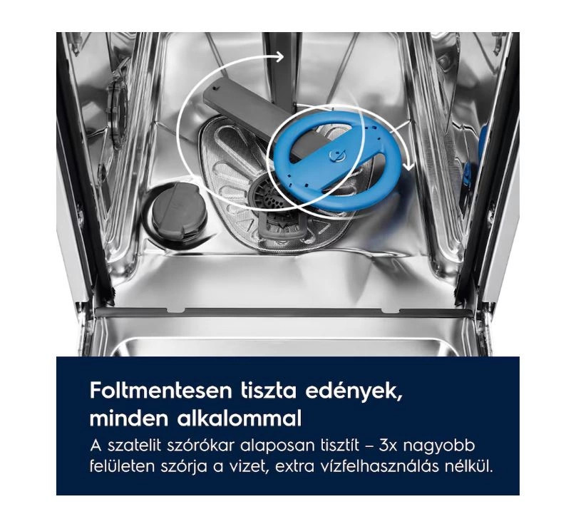 Az edények makulátlanul tisztán kerülnek elő a SatelliteClean® mosogatógépből – akár 3x jobban teljesít, mint a hagyományos mosogatógép. Duplán forgó karja folyamatosan változtatja a permetezés szögét, így még a terjedelmesebb edényeket is alaposan megtisztítja.