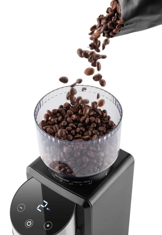 Az érintővezérlésű LED kijelző lehetővé teszi a könnyű beállítást és az őrlés nyomon követését. A 250 g kávészem kapacitás elegendő készletet biztosít több csésze kávéhoz, anélkül, hogy folyamatosan utántölteni kellene.