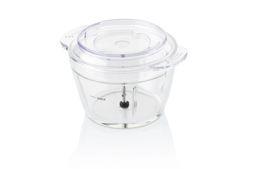 Praktikus aprító üvegedénnyel és éles titánium pengével az ételek tökéletes aprításához és keveréséhez.