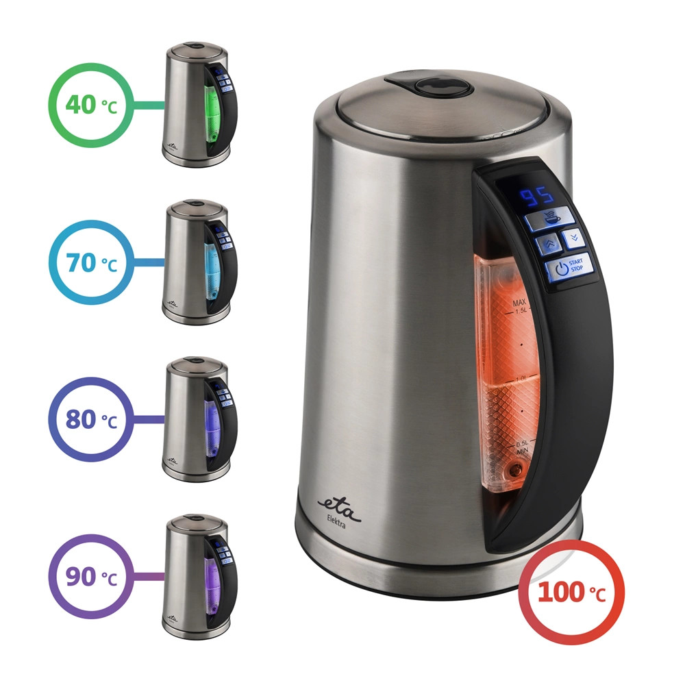 A vízforraló automatikus kikapcsolási renszerrelfelszerelt, amely a forráspont, vagy a beállított hőmérséklet elérésénél működik. Természetes a háromszoros biztonsági rendszere is, amly aktiválja a biztosítékot túlmelegedés, vízhiány és bázisról való eltávolítás esetén. Az ETA ELEKTRA vízforraló KEEP WARM funkcióval is rendelkezik, amely megtartja a víz hőmérsékletét a beállított hőfokon.
