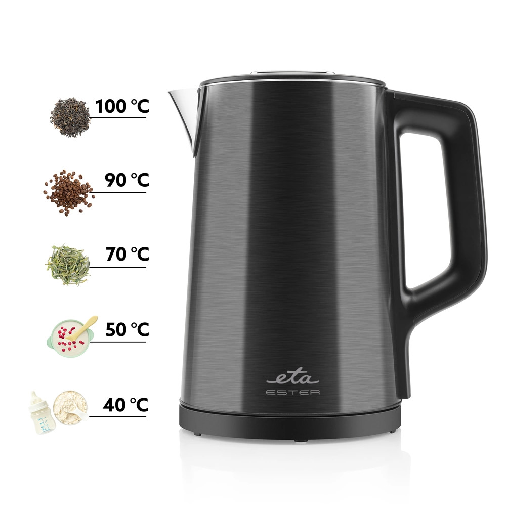 Az ETA Ester vízforraló kétfalú kivitelű, szabályozható hőmérséklettel rendelkezik és akár 2200 W teljesítményt nyújt.