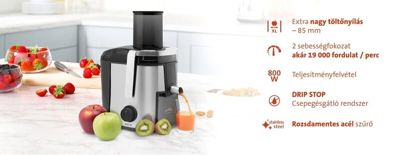 A rozsdamentes acél szűrő kiváló gyümölcs- és zöldséglevet biztosít. Az 1,8 literes hulladéktárolónak köszönhetően nem kell aggódnia a gyakori ürítés miatt. A DRIP STOP csepegésgátló rendszer megakadályozza, hogy nem kívánt cseppek kerüljenek a konyhapultra, amit különösen értékelni fog a répa vagy ribizli feldolgozása során.