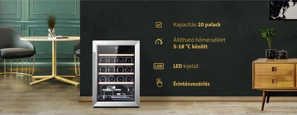 A palackokat kényelmesen elhelyezheti a négy krómozott polcon, amelyek fa előlappal rendelkeznek, így a borok szépen mutatnak. A belső LED világítás segít a borok tájékozódásában, miközben energiatakarékos és nem bocsát ki nem kívánt hőt.