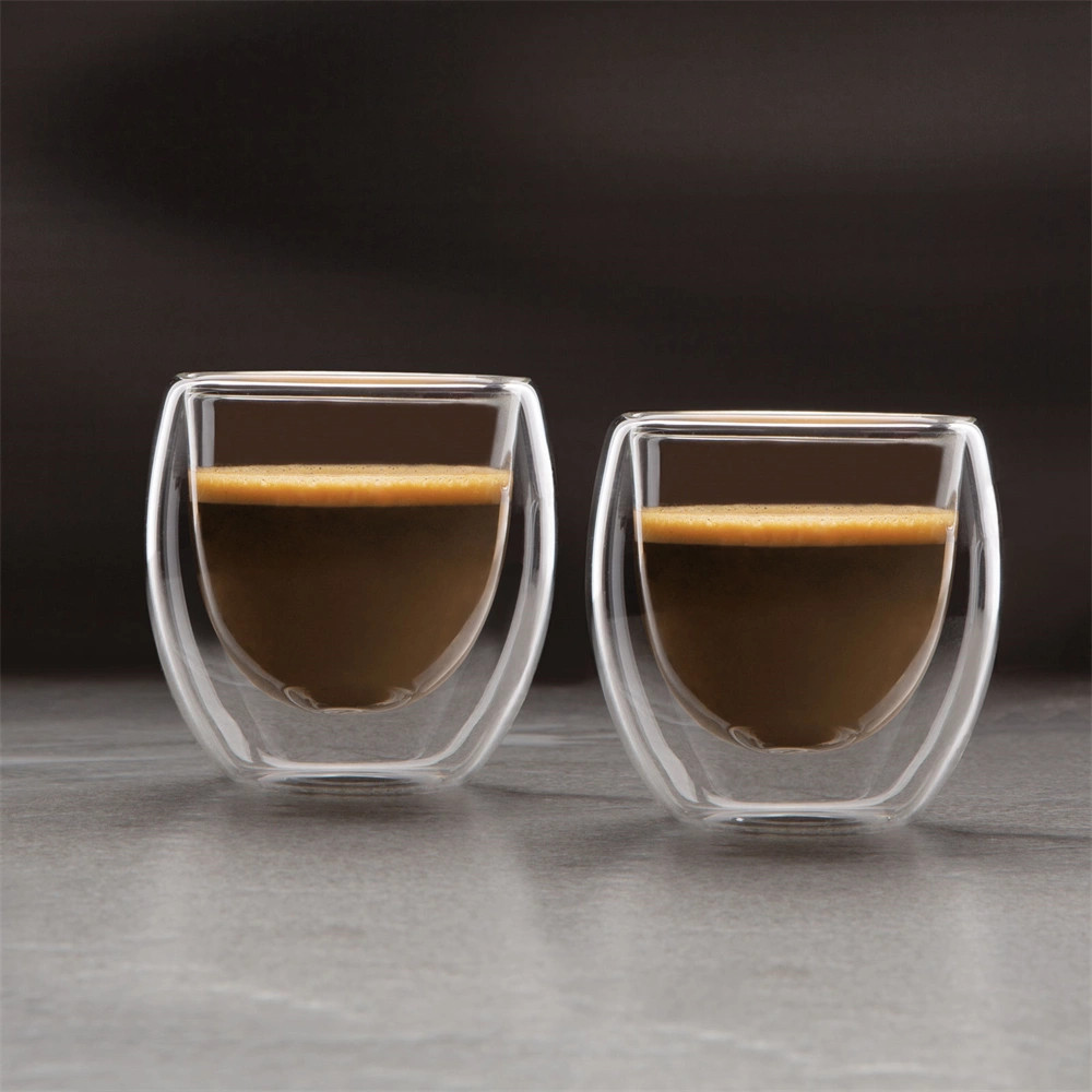 Az önfeledt kávézás, italfogyasztás öröme érdekében modern megjelenésű, duplafalú, boroszilikát üvegből készült pohár szett. Kiválóan alkalmas kávézáshoz, forró és hideg italok fogyasztására is. A dupla üvegfalnak köszönhetően a forró italok nem égetik meg a kezet.