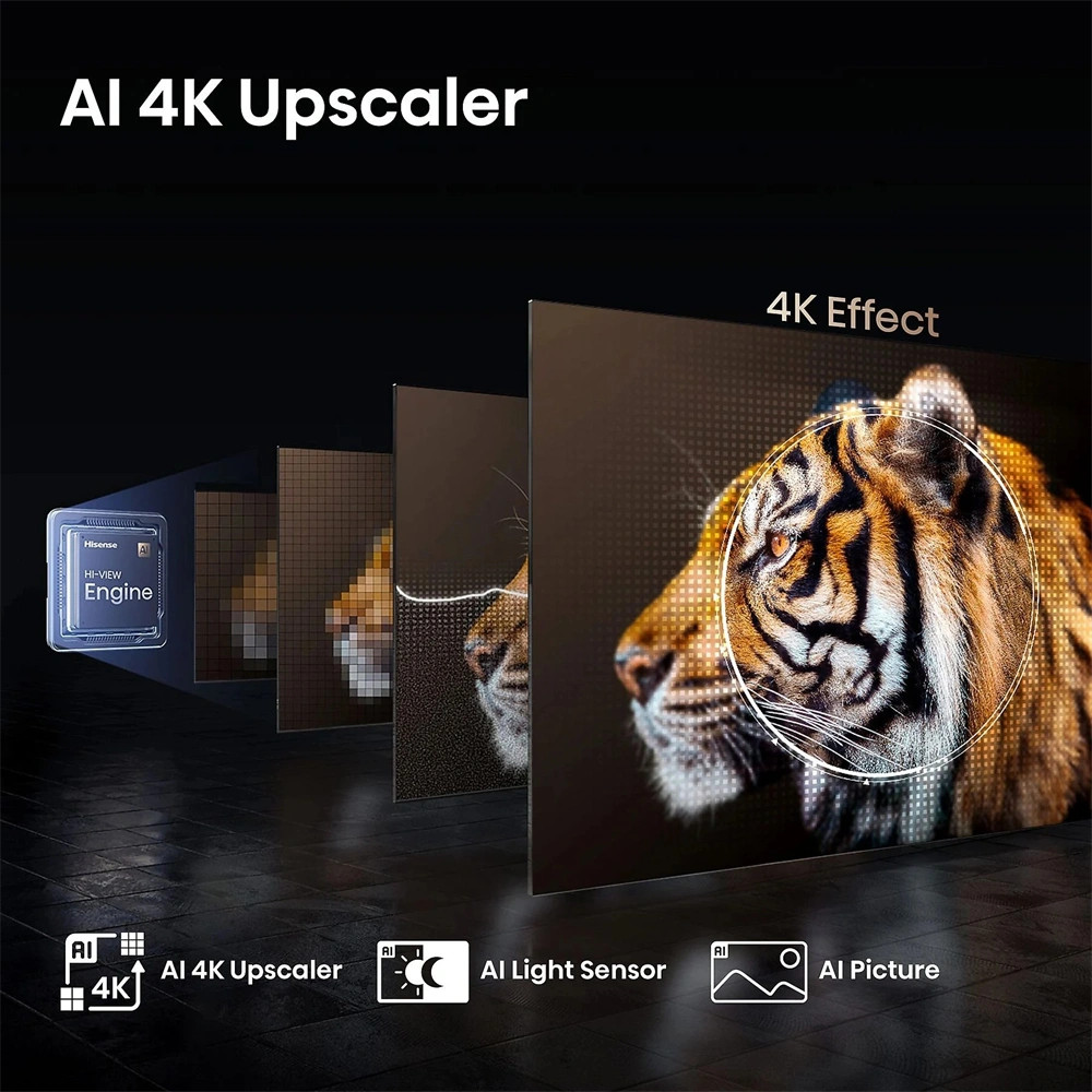 A Hisense AI 4K Upscaler páratlan tisztaságot nyújt minden kedvenc tartalmadhoz. Ez az intelligens funkció nemcsak a régi klasszikusaidat és házi felvételeidet alakítja át, hanem a modern tévéadásokból, filmekből és streaming tartalmakból is lenyűgöző 4K minőséget varázsol. Minden egyes pixel a televíziód teljes erejével kel életre.
