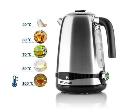 Az 1,7 literes kapacitású rozsdamentes acél Hyundai VK 770 vízforraló elegáns megjelenésének köszönhetően stílusos kiegészítője a konyhának.