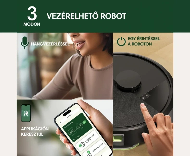 - Háromféle vezérlési mód az iRobot Home alkalmazással vagy hangutasításokkal