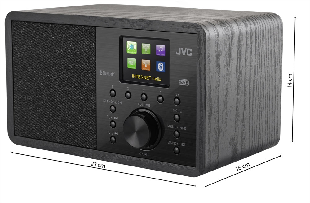 Fedezze fel a tökéletes zenei élményt az új JVC internetes rádióval, amely ötvözi a modern technológiát és számos funkciót. A nagy, 2,4"-os színes kijelzőnek köszönhetően mindig kéznél van minden információ – legyen szó akár 30 internetes rádióállomás választásáról, 30 DAB+ előbeállításról vagy 30 FM állomásról.