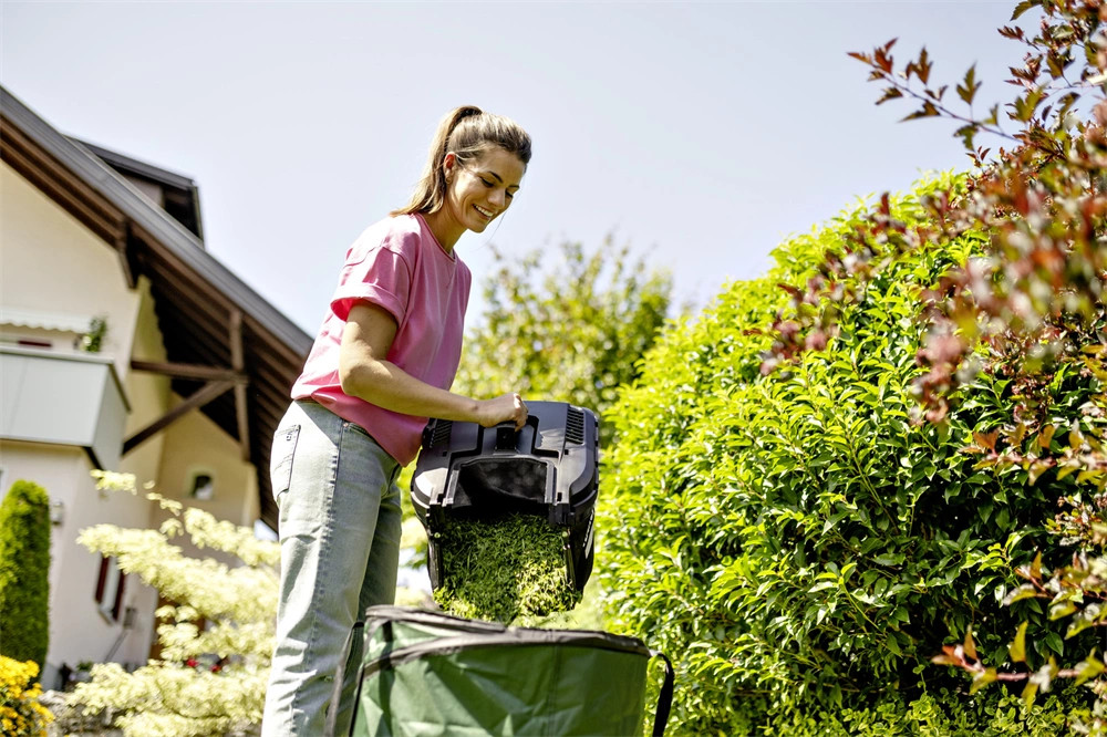 Könnyű és fordulékony: 32 cm-es vágási szélességével az LMO 2-18 akkumulátoros LMO 2-18 akkumulátoros fűnyíró ideális kisebb, legfeljebb 250 négyzetméteres gyepfelületekre. A vágási magasság öt fokozatban állítható, 25 és 60 mm között. Az erős, kefe nélküli motorral kombinálva a fű mindig precízen vágható. Szélek vagy szegélyek mentén történő nyíráskor a fűfésűk kiegyenesítik a fűszálakat, így biztosítva, hogy egyetlen fűszál sem marad ki. A fűnyesedék a 30 literes fűgyűjtő tartályban gyűlik össze. Az állítható magasságú vezetőfogantyú biztosítja a függőleges, kényelmes testtartást fűnyírás közben, az összecsukható kialakítás pedig helytakarékos tárolást tesz lehetővé. A szállítási fogantyúval a könnyű akkumulátoros fűnyírót bárhová, például lépcsőn fel és le is lehet vinni. Egy akkumulátor és egy gyorstöltő tartozik a szállítási terjedelemhez.