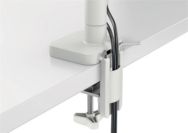 -könnyen felszerelhető a mellékelt gyorskioldású, levehető Vesa® lemezzel (75 és 100 mm) és szilikon gumírozott U-alakú szorítópánttal, amely csökkenti a rezgéseket és védi az íróasztal felületét, vagy az asztalon található furaton keresztül (asztali vastagságtartomány: 10-80 mm)