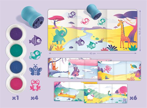 A 6 különböző foglalkoztatólap segítségével játékos módon fejlődhet a gyerekek kézügyessége és képzelőereje. A készlet minden szükséges eszközt tartalmaz az önfeledt szórakozáshoz. Válaszd a madár, béka, hal vagy pillangós nyomdát, mártsd bele a kiválasztott színű tintába és kezdődhet is a móka! A nyomdák tökéletesen illeszkednek az apró kezekbe, így a gyerekek egy könnyed mozdulattal dekorálhatják ki a foglalkoztató lapokat.
