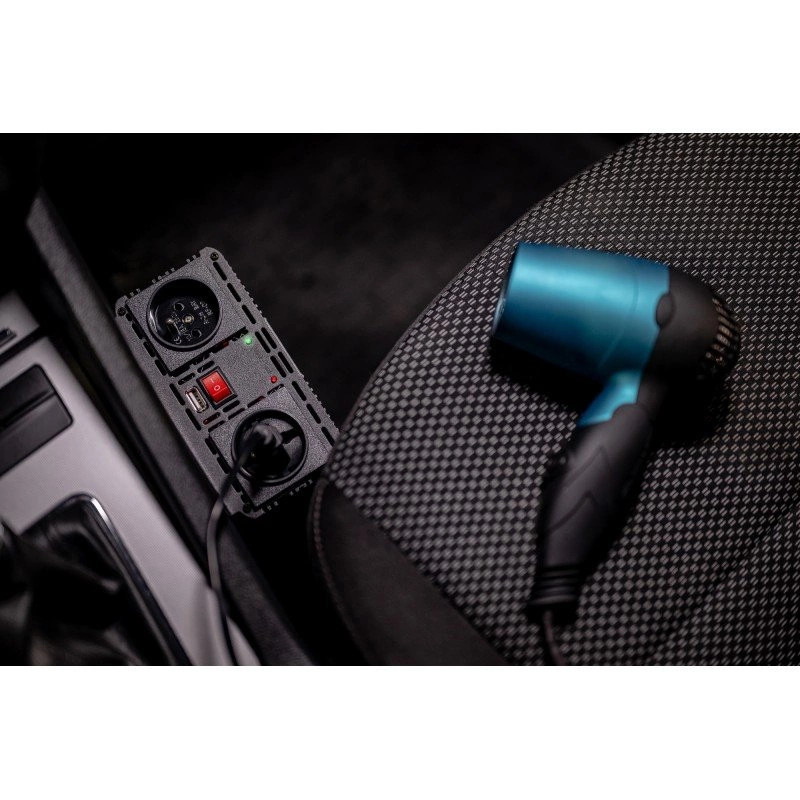 - a 24 V-os akkumulátor egyenfeszültségét ~230 W váltóárammá alakítja át