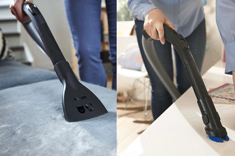 Egy porolókefe-tartozék található közvetlenül a fogantyúba építve, ami mindig készen áll a bútorokhoz, lapos felületekhez és kárpitokhoz.