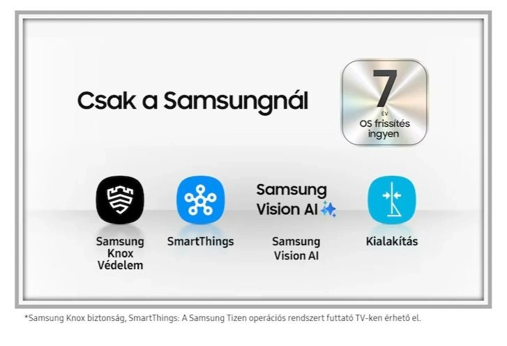 A One UI Tizen személyre szabott képernyőélményt nyújt. A Samsung Tizen operációs rendszer segítségével a legújabb innovatív Samsung funkciókat kínálja. Az élmény biztonságáért a Samsung Knox felelős, amely SmartThings eszközeidet védi. Ráadásul a One UI Tizen a következő 7 évben támogatja a Tizen OS frissítéseket.