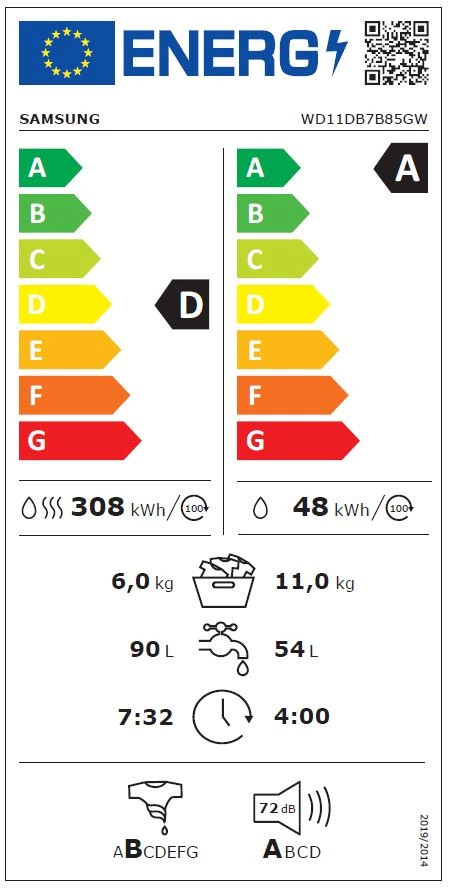 - Energiahatékonysági osztály (Csak mosás): A
