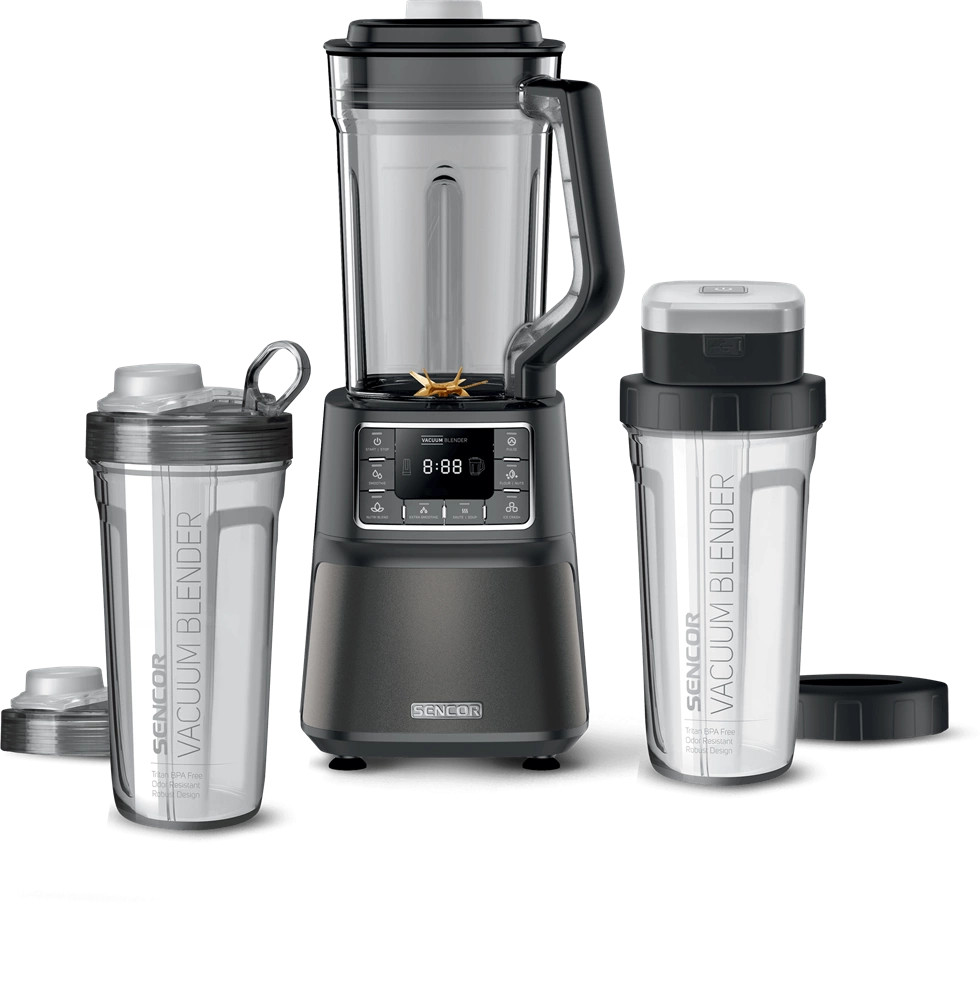 A csomagolás tartalma: 1,5 l-es Tritan (PCTG) mixelő edény, 0,7 l-es tároló edény a friss italok (smoothie) tárolásához, vákuumképző egység