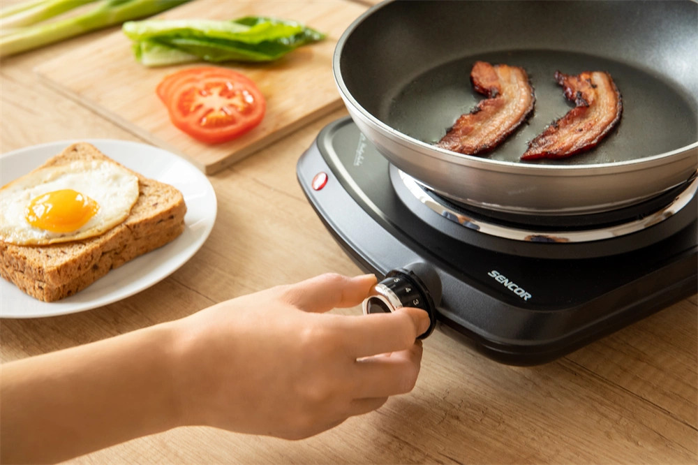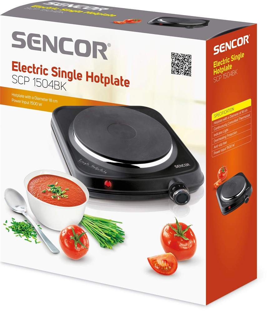 A Sencor SCP 1504BK-EUE4 egy főzőzónás elektromos főzőlap ideális választás lehet nyaralóba, kollégiumba. A kompakt kialakításának köszönhetően nem igényel nagy helyet és beüzemelése is könnyen, egyszerűen elvégezhető. A tűzhely 18 cm átmérőjű főzőfelülettel, 1500 W teljesítménnyel és folyamatosan szabályozható termosztáttal lett felszerelve. A használatát egy működést jelző lámpa könnyít meg. A kiváló stabilitást a csúszásgátlóval ellátott lábak biztosítják.