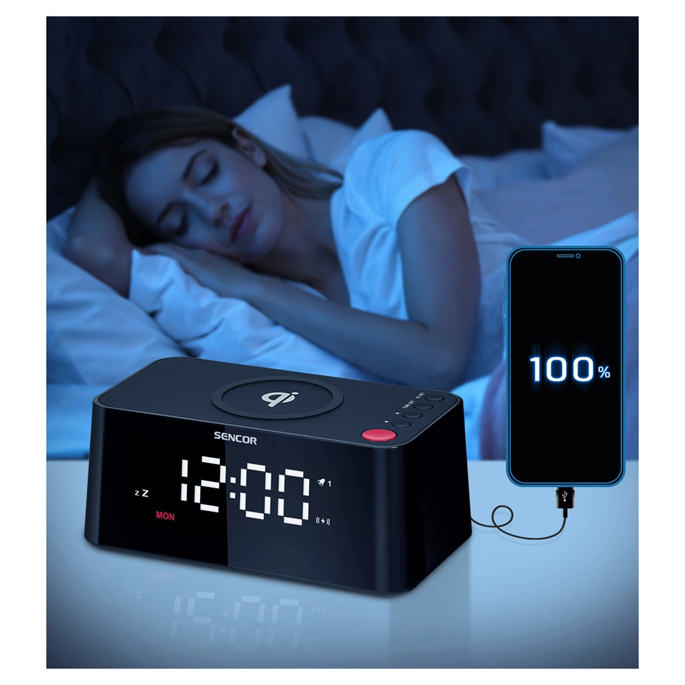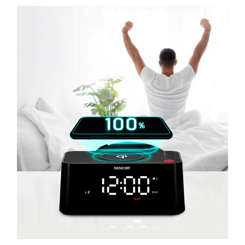A vezeték nélküli töltési funkcióval rendelkező ébresztő óra a mindennapok megkönnyítésére szolgál. Egyetlen készülékben kombinálja az ébresztőóra és a vezeték nélküli töltés lehetőségét a mobiltelefon számára. Többé nem kell kábelekkel bajlódnia, egyszerűen helyezze le a kompatibilis telefonját az óra tetejére, és azonnal kezdődik a töltés. Ezáltal időt és energiát spórolhat meg, miközben a mobiltelefonját mindig teljesen feltöltve és készenlétben tarthatja.