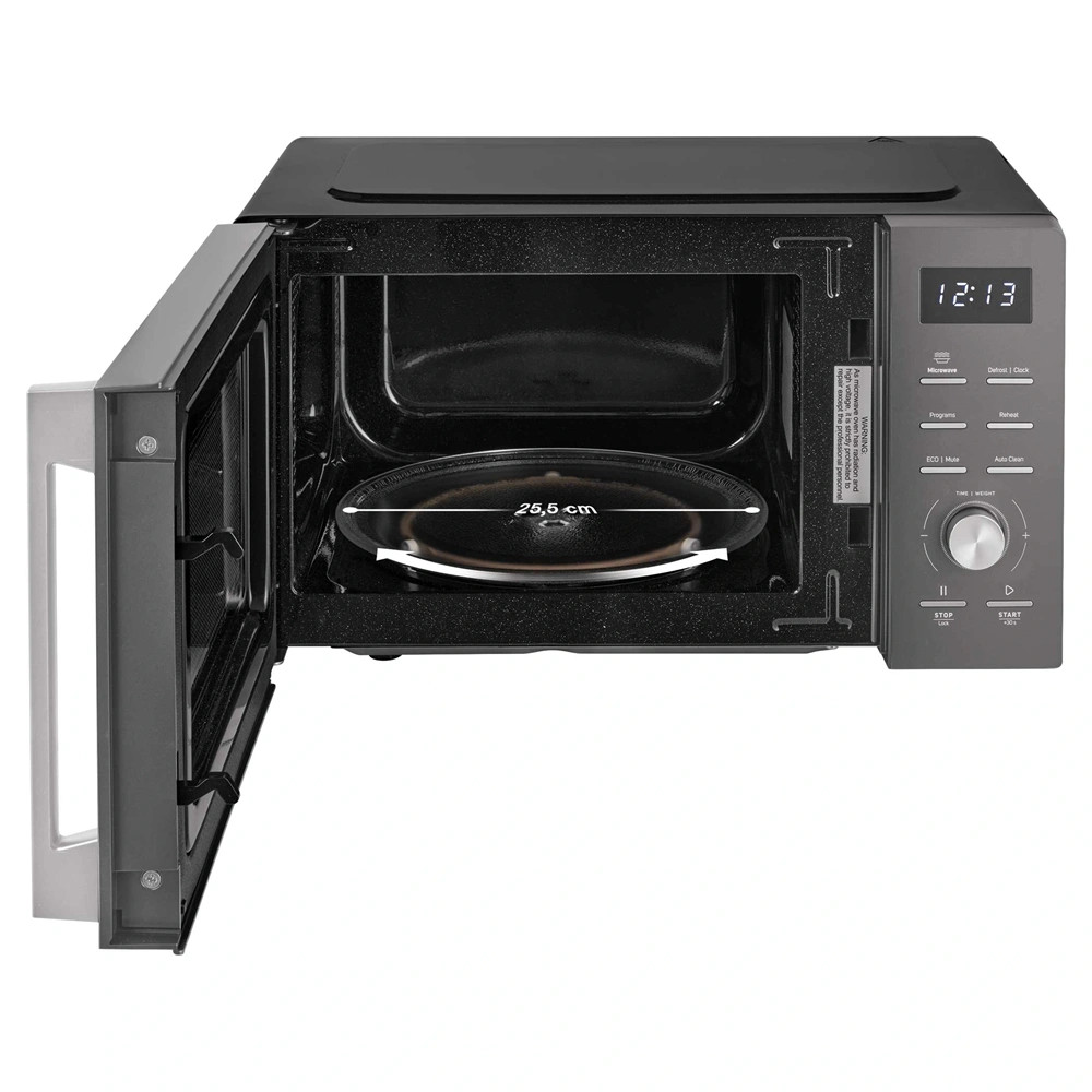 A készülék gyermekbiztonsági zárral rendelkezik, így a konyhában való használat teljesen biztonságos. A 25,5 cm átmérőjű forgótányér biztosítja az egyenletes melegítést, míg a kerámia jellegű belső felület karcálló és könnyen tisztítható. Az Auto Clean funkció tovább egyszerűsíti a karbantartást, így a sütő mindig higiénikus marad.