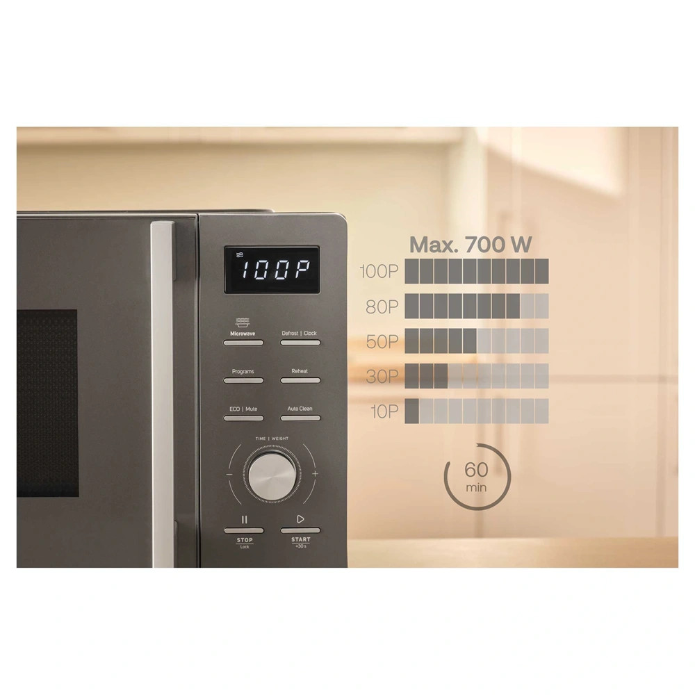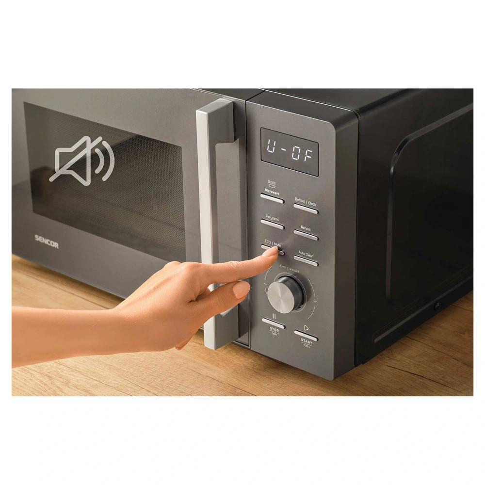 A Sencor mikrohullámú 5 teljesítményszinttel rendelkezik, így minden ételhez megtalálhatjuk az ideális beállítást. A kiolvasztás súly és idő alapján történik, míg a 8 előre beállított főzési program megkönnyíti a mindennapi használatot. Az újramelegítés funkció szintén súly alapján működik, így mindig tökéletesen meleg ételt kapunk. A 60 perces időzítő hangjelzéssel és MUTE funkcióval teszi lehetővé a figyelmeztetések személyre szabását.